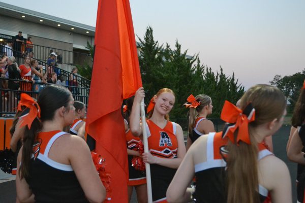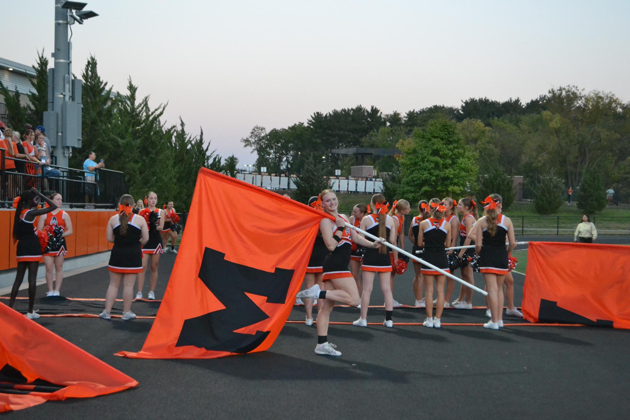 Cheerleaders (Senior Edyn Cowels and Junior Leah Geisinger) pose with flags that will spell out Ames, ready to run when the football players come out to the field