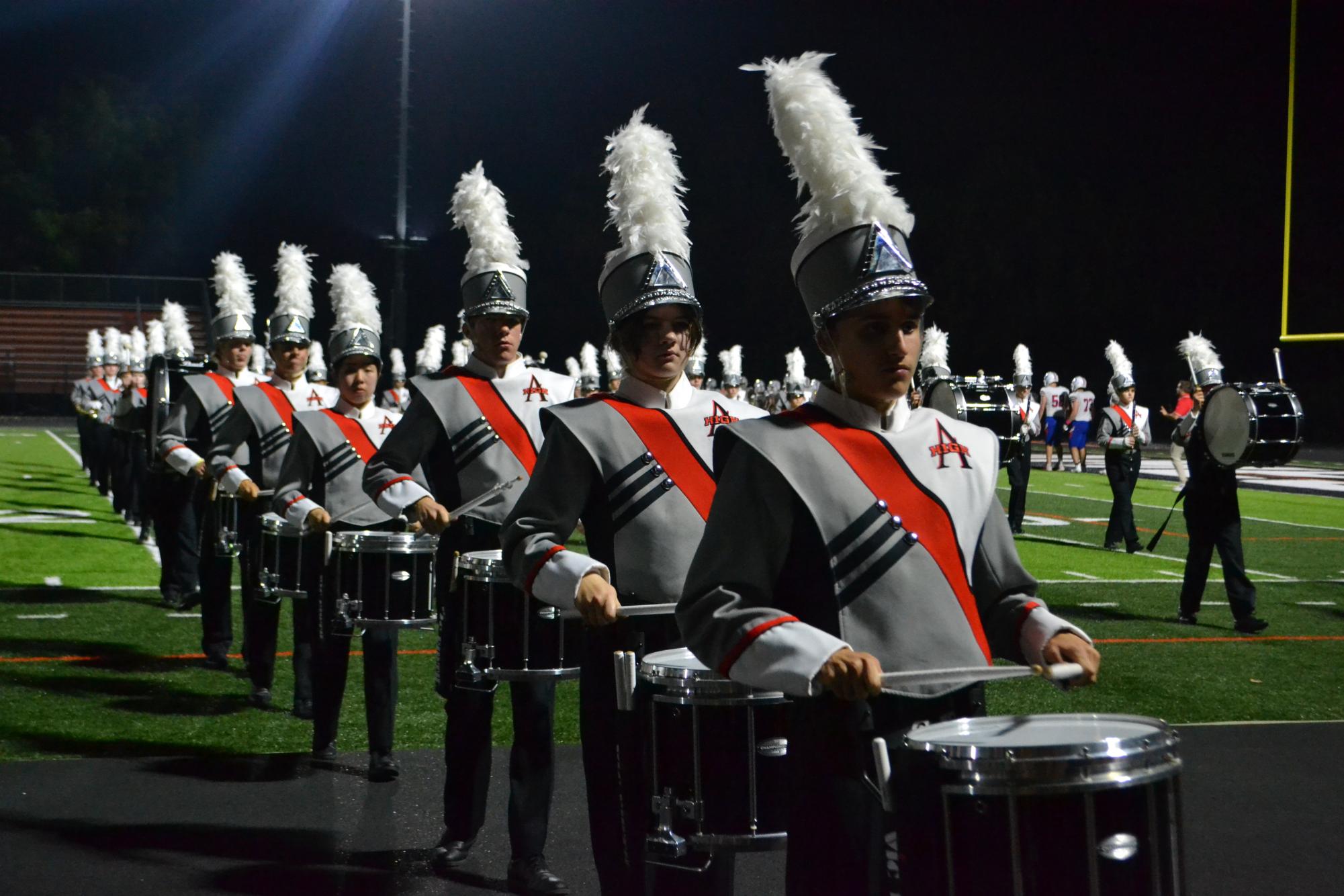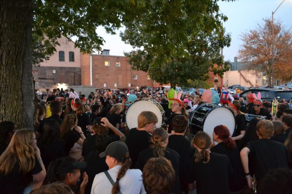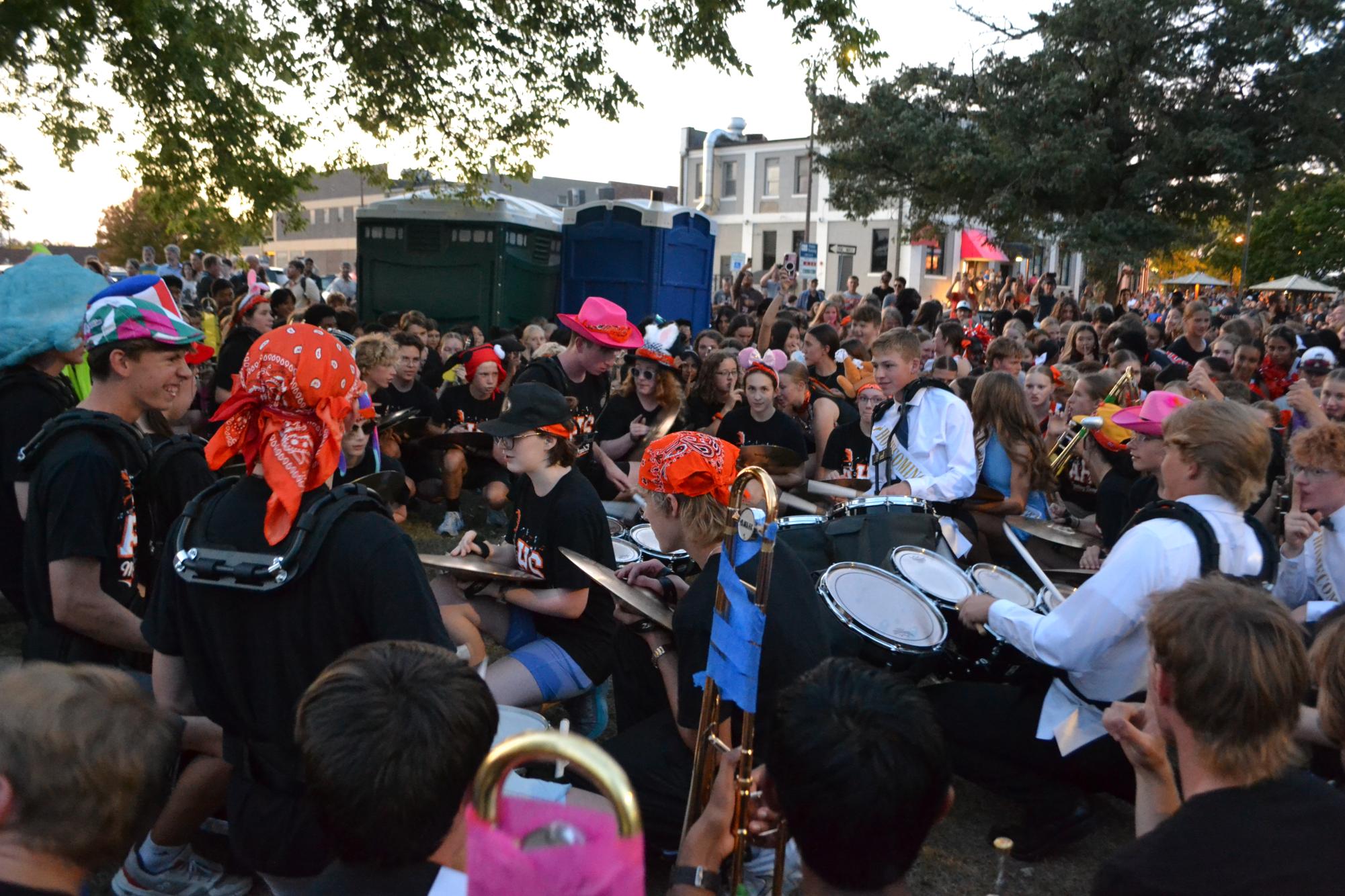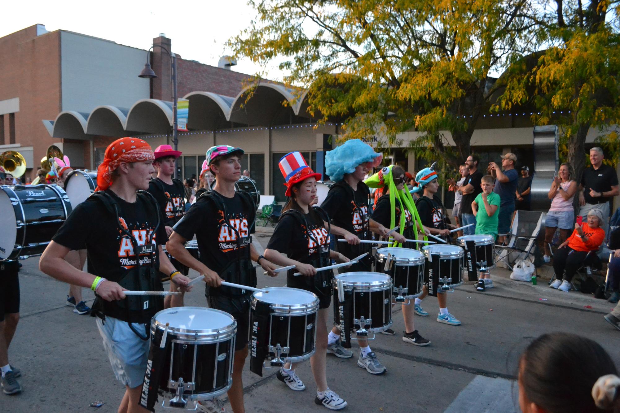 Ames High drumline walks down mainstreet with the rest of the Band, sporting fun hats an odd tradition for the Homecoming parade.Band students march in step. Playing behind baton twirler Madison Mowrer!