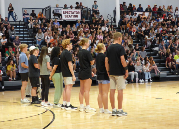 Members of the homecoming court line up and get ready to play some games at the assembly.